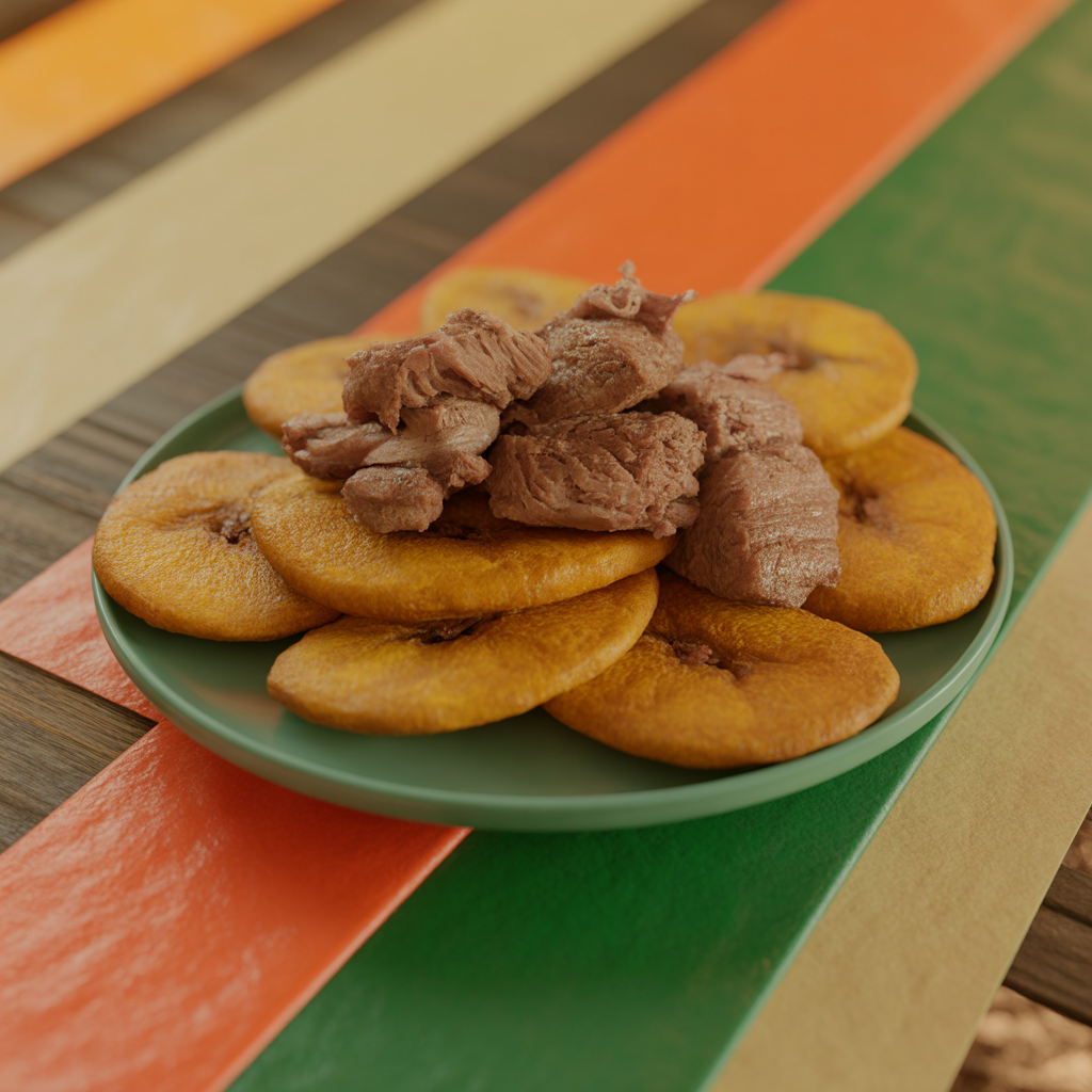 Plátanos verdes fritos acompañados de carne jugosa y ensalada fresca. Un clásico panameño que combina texturas y sabores únicos.